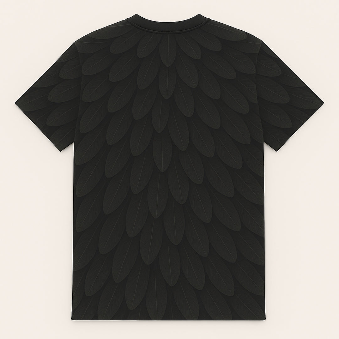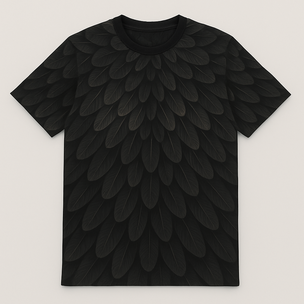 Drape yourself in elegance with the Nocturne Plume, where midnight meets movement. This all-over print t-shirt features a high-definition layered feather design, meticulously arranged to mimic the regal armor of a raven—mysterious, bold, and endlessly sophisticated.